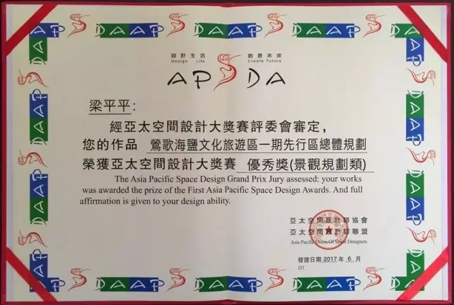 在此,祝贺我协会会员企业海南广轩装饰设计工程有限公司总经理、协会设计委委员、北京方圆水木旅游规划设计院海南分院院长梁平平老师,一举夺得亚太空间设计大奖赛(景观规划类)优秀奖,为海南设计界赢得荣誉。