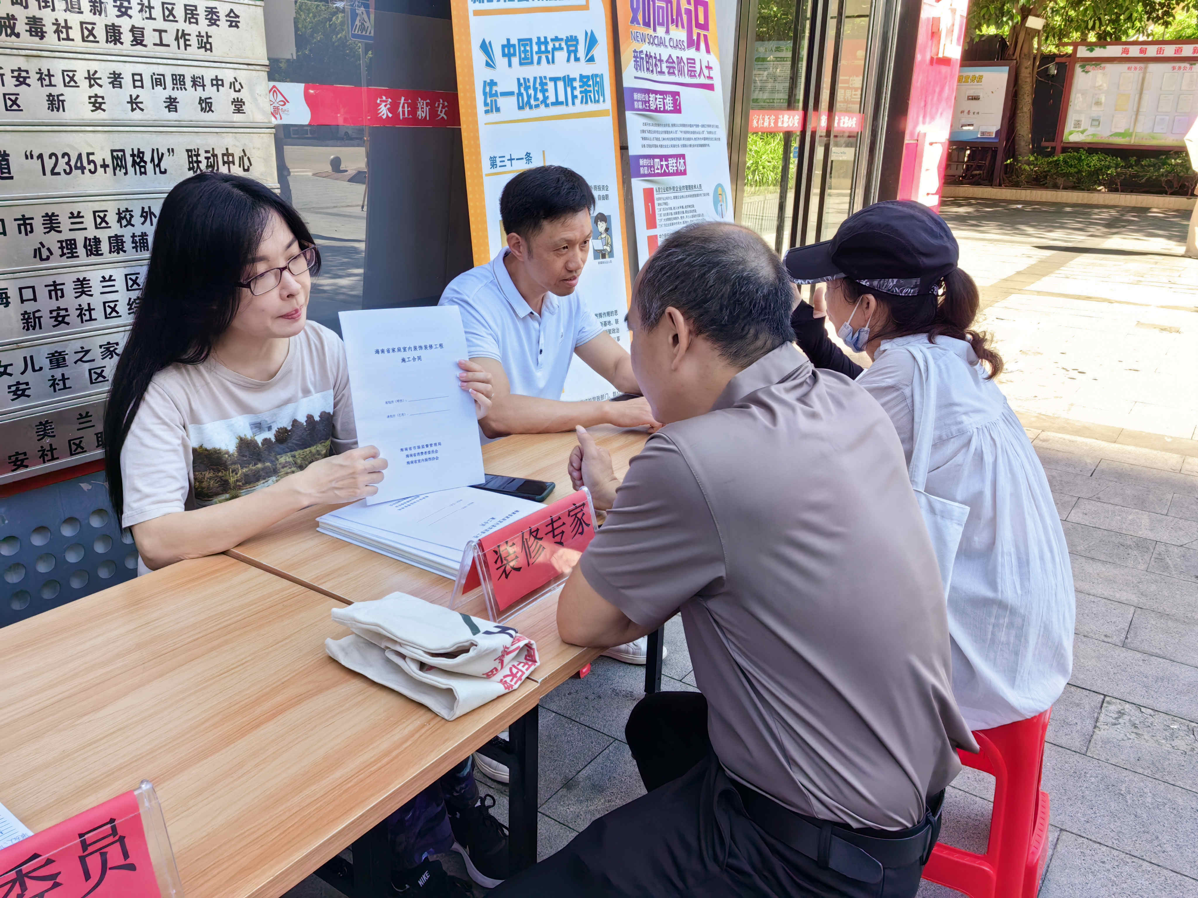 活动首站走进海口市美兰区海甸街道新安社区,开展房屋装修、法律解答、物业管理、垃圾分类等多方面公益咨询服务。海口市政协委员,省新联会副秘书长,市新联会副会长,省业协天涯同心工作站站长肖江涛;海南省室内装饰协会会长王抒;海南省质量协会秘书长陈燕;省爱心社工志愿者协会党支部书记张毅;海口市人大代表李金龙;龙华区人大代表甘斌彬,省新联会志愿服务队队长李翔,市物调委人民调解员温凤龄等各领域专家围绕业主们在社区生活中碰到的堵点、难点等问题,通过面对面交流,逐一解答。现场交流气氛活跃,专家代表们务实的工作态度,得到了业主们的一致好评。
